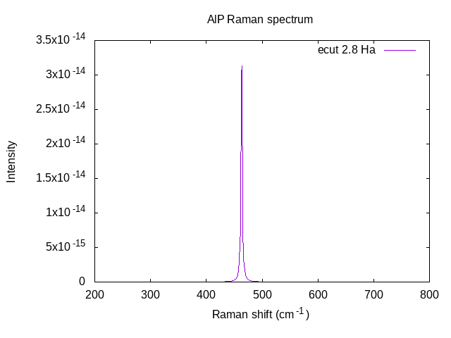 The resulting powder-average spectra, plotted here with Gnuplot, is shown below. For the cubic structure calculated here, the resulting spectra contains a single Raman TO mode corresponding to an XY polarization.
