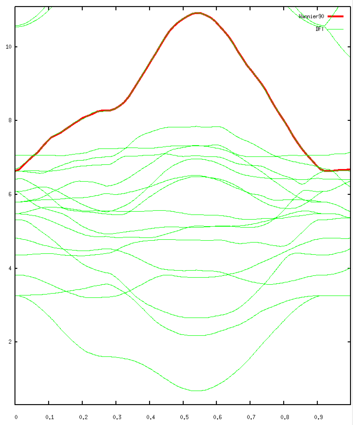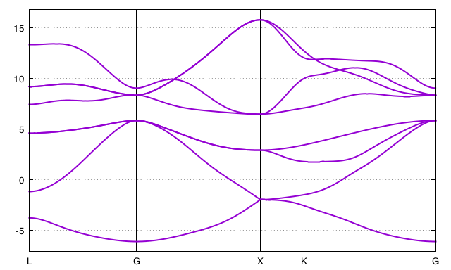Finally, we want to compare the resulting band structure with the one coming from the Kohn-Sham basis. This is enforced using the bands_plot keyword, along with a defined path which corresponds to the same path as the one calculated in ABINIT.