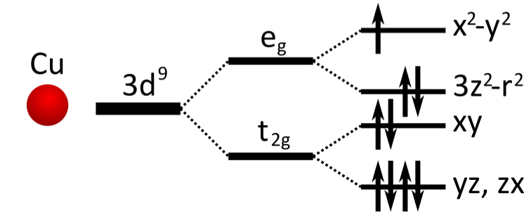 In vaccuum, these 10 states are degenerate. However, La2CuO4 here has a layered perosvkite structure, which means the cupper atom feels a crystal field produced by the surrounding atoms. In particular, an octaedron of oxygen with lift the degeneracy of the 3d shell into two subshells: the t2g and eg shells. Furthermore, the elongation of this octaedron splits even more these subshells. The resulting splits are illustrated in the following figure.